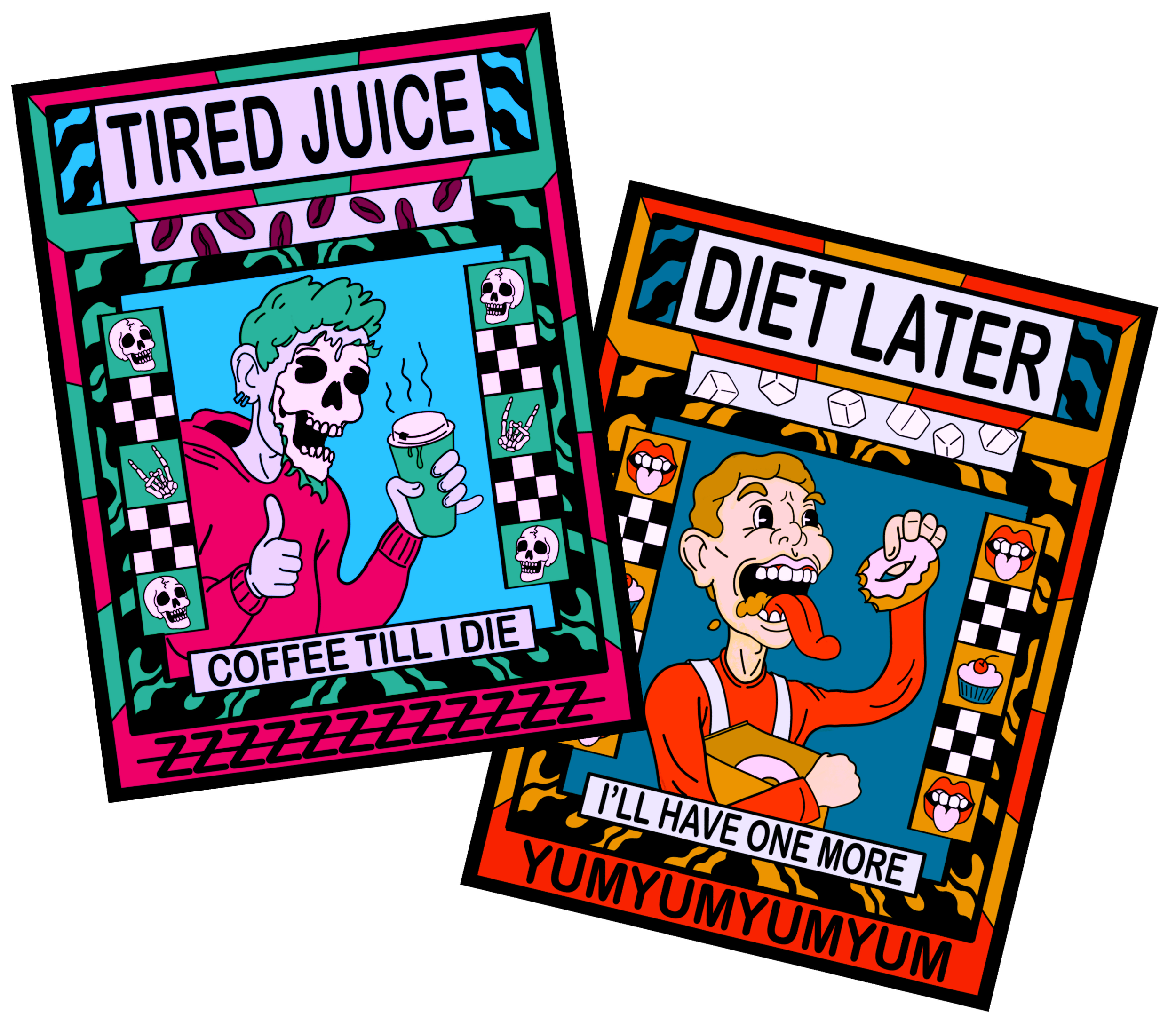Concert Poster Drawing Death TĂĄrevĂĄtt, Concept art Mural Neo Tokyo, Concept art BORN-series, stickers Myriad, bookmark Trolldomsprosessene (Witch Hunt), a short-comic T-shirt designs Moving Forward, Poster series Book Cover KLISTREMERKE, logo