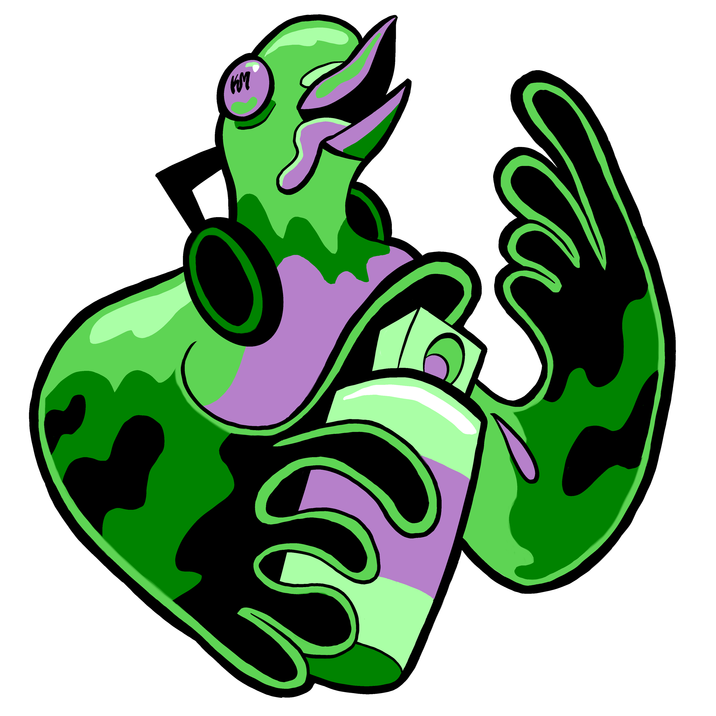 Abstract illustration of a creature with a green body, purple and black details, large eyes, and holding a spray paint can, on a black background.
