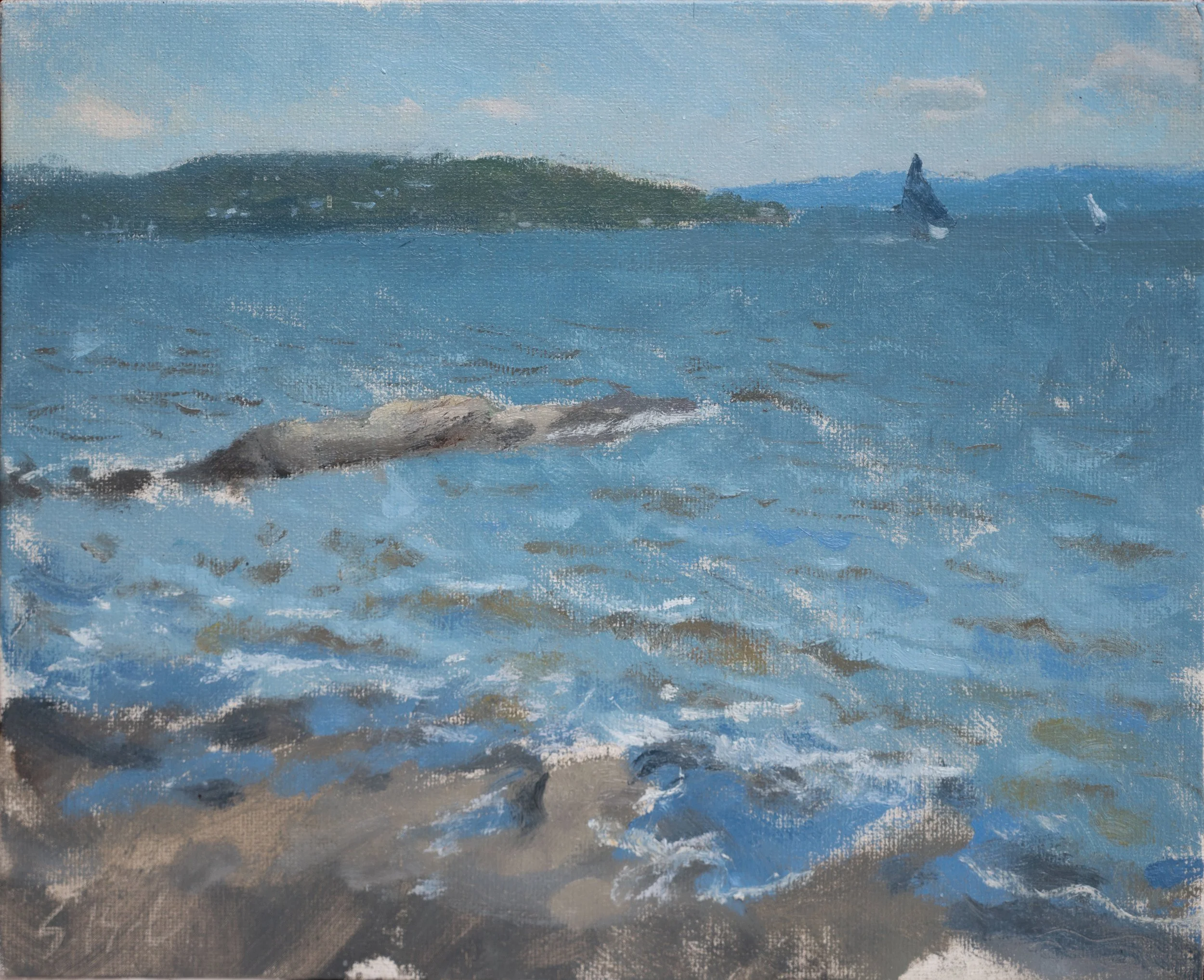 A painting of a seascape with a rocky shoreline in the foreground, blue water, sailboats in the distance, and a green hilly landmass under a partly cloudy sky.