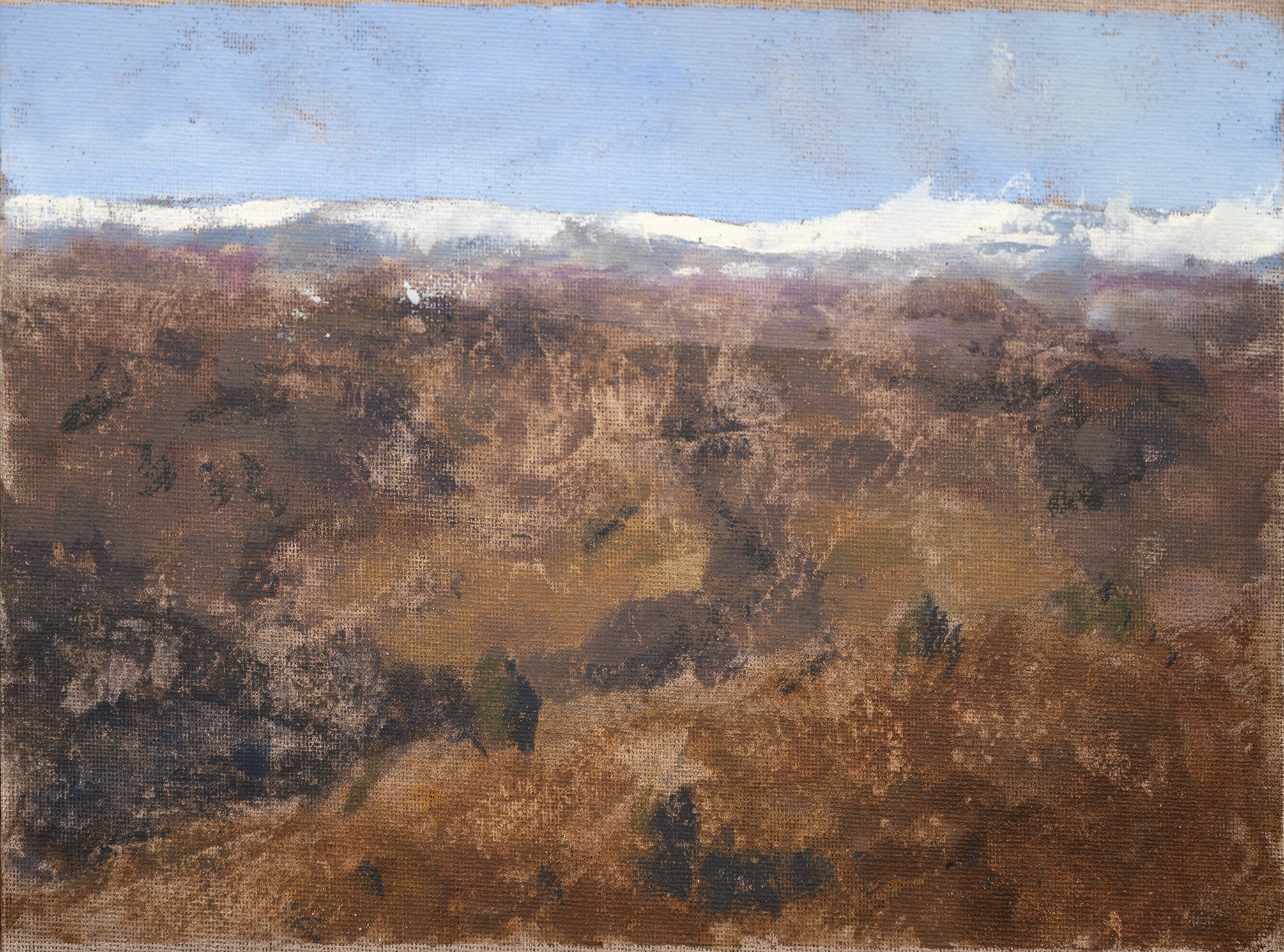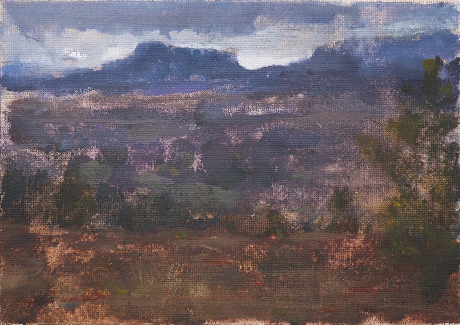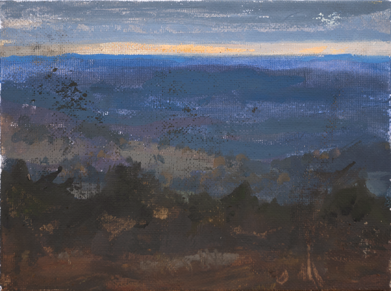 Landscape painting of distant mountains and a sunset sky, with dark foregrounds and shades of blue, purple, and orange.