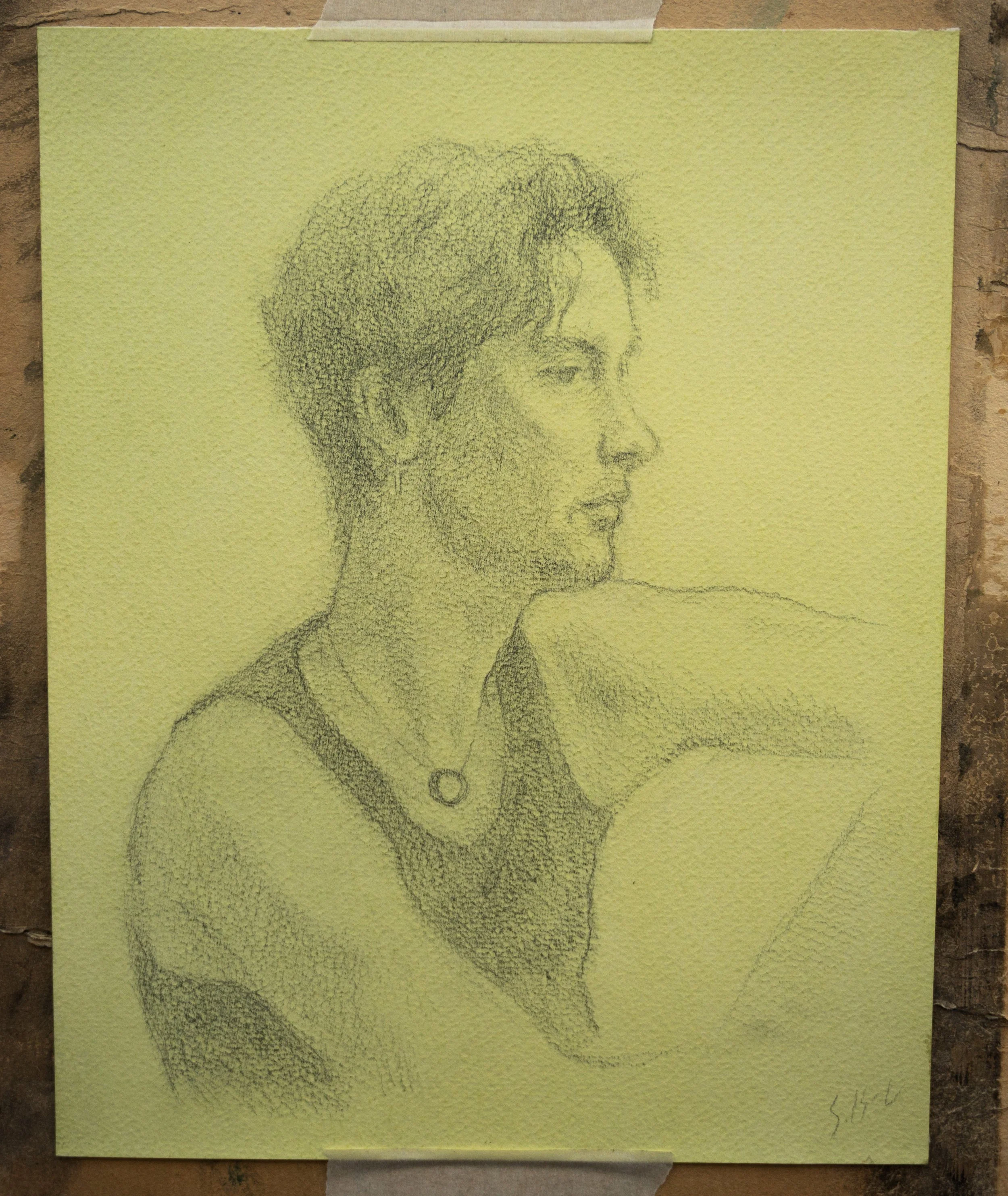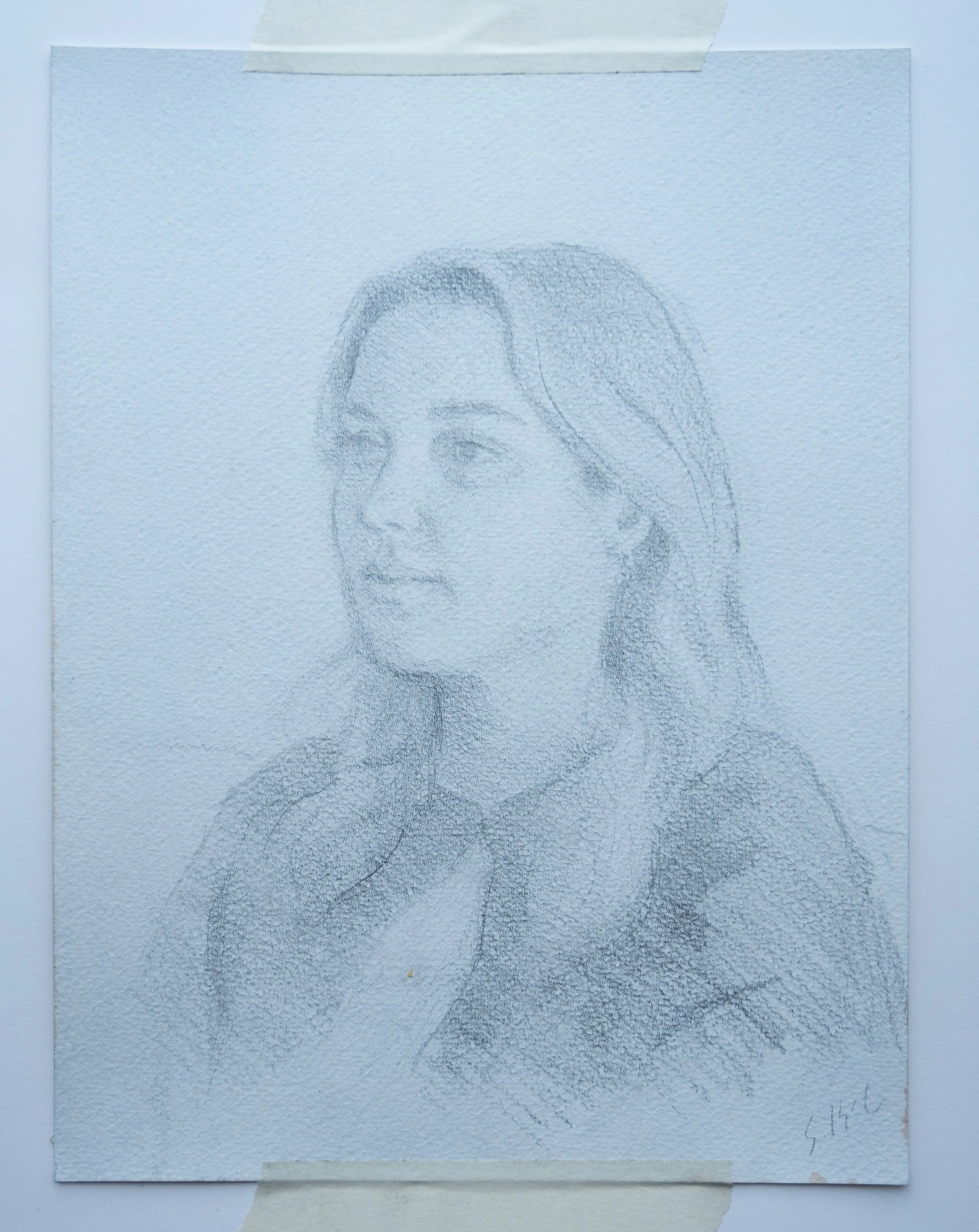 A pencil sketch portrait of a young woman with long hair, facing slightly to the left, on textured paper taped at the top and bottom.