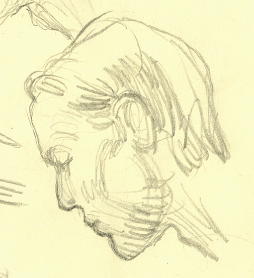 A colorful sketch of a character with large ears, glasses, a big nose, and a beard, with a green outline on the side of the face.