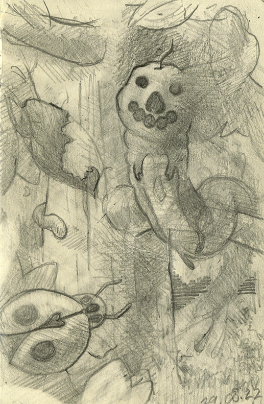 A hand-drawn sketch of a whimsical scene featuring a smiling caterpillar with a face and several ladybugs on leaves and stems, set in a garden or forest environment.