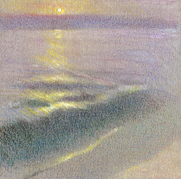 Abstract textured artwork with soft pastel colors and light streaks resembling a sunset or sunrise.