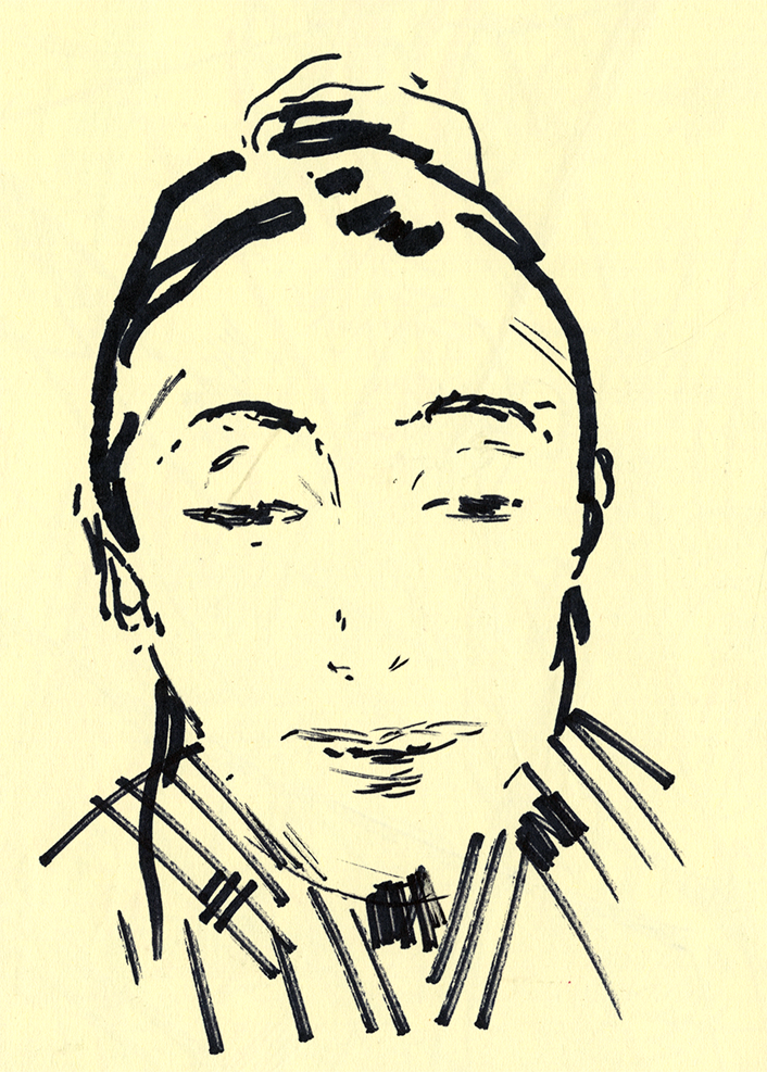 A minimalistic black and white sketch of a woman with closed eyes, her hair tied up and a calm expression.