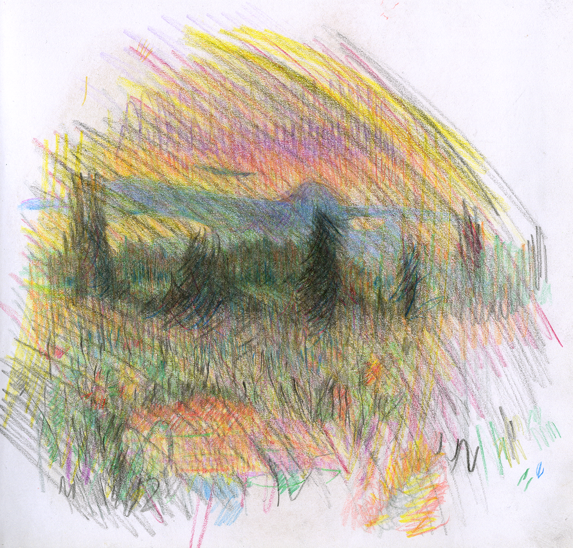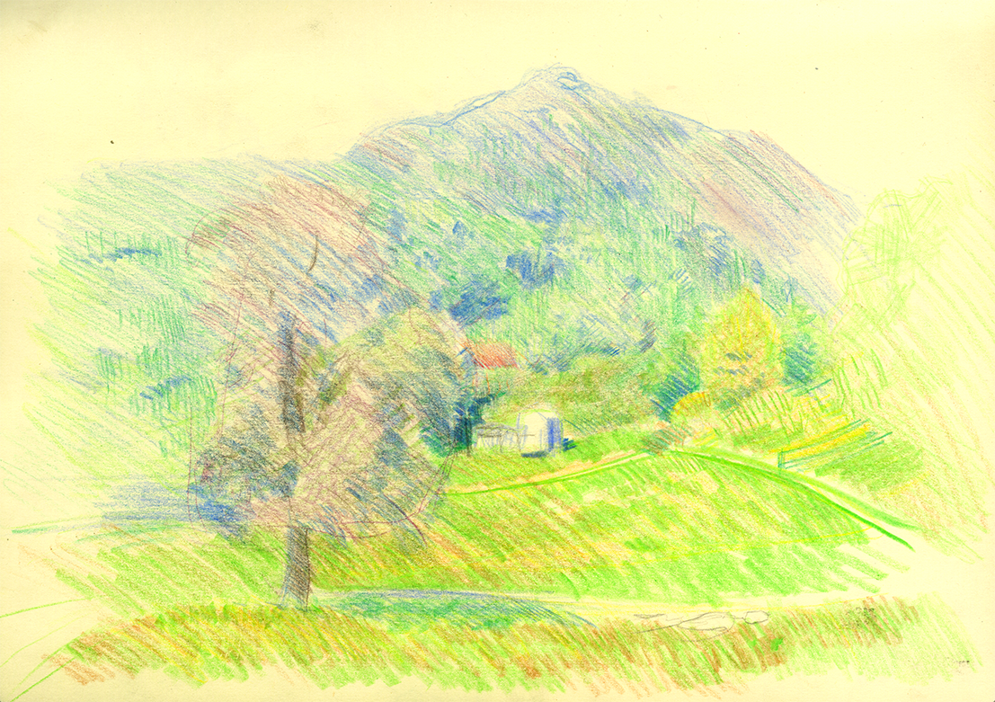 Colorful landscape drawing of a hill with trees, a small house, and a sunny sky.