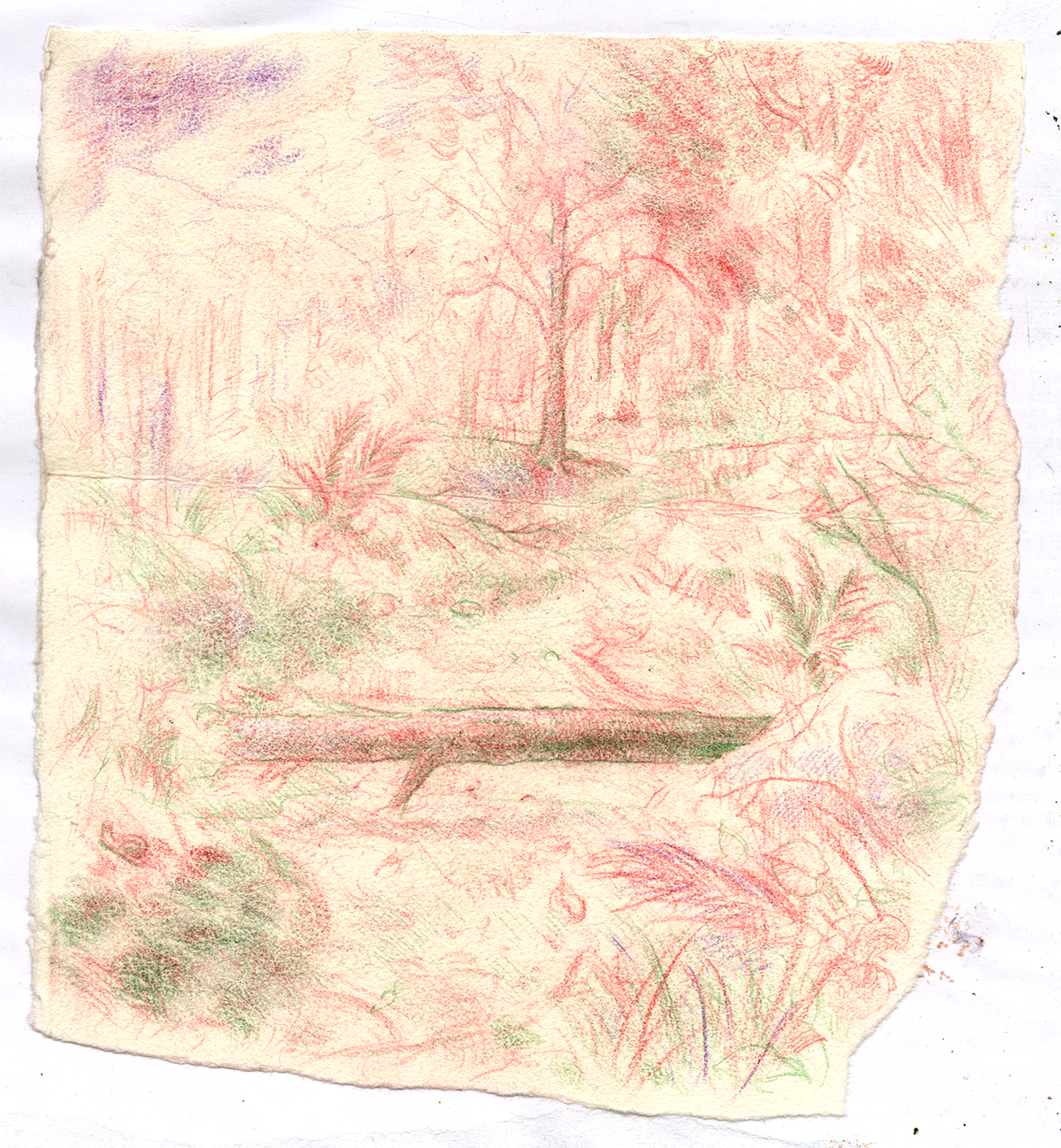 A hand-drawn landscape on crumpled paper featuring trees, foliage, and a pathway in pastel colors, primarily red, green, and purple.