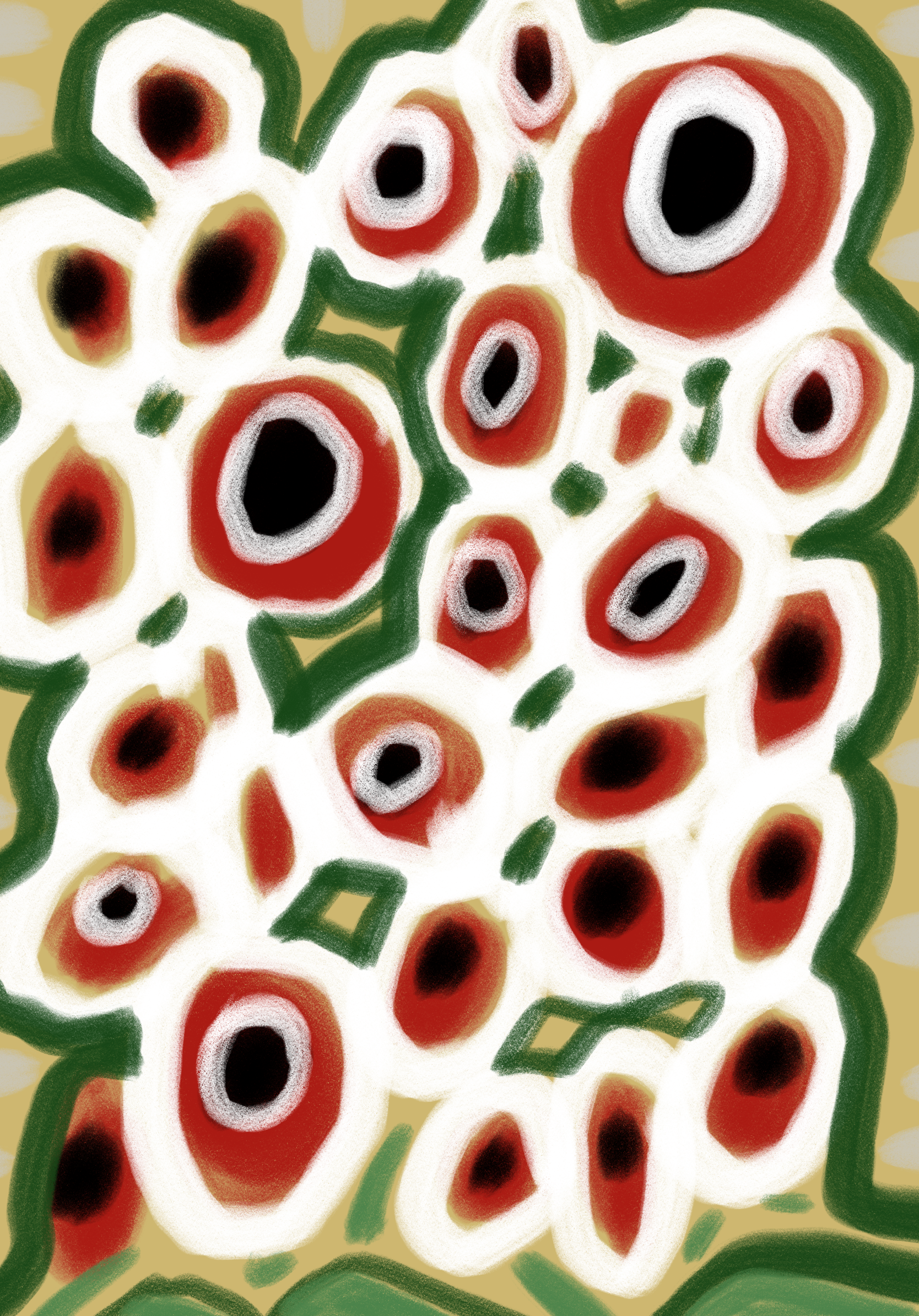 An abstract painting of red flowers with black centers and green outlines on a beige background.
