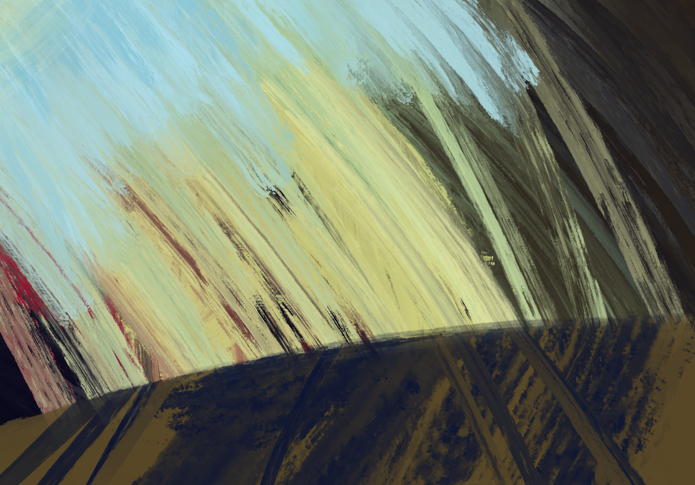 An abstract digital painting of a landscape with stylized railroad tracks in the foreground and vibrant streaks of color representing a sky, in shades of blue, yellow, and black.