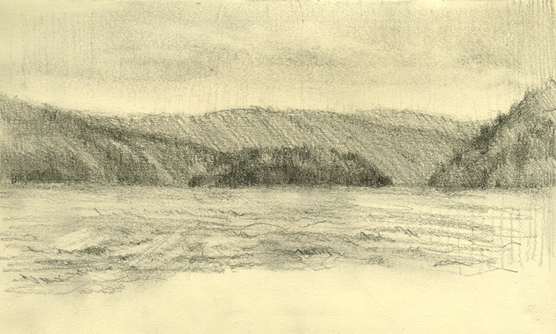 A pencil sketch of a landscape featuring a body of water with ripples, surrounded by mountains in the background under a cloudy sky.