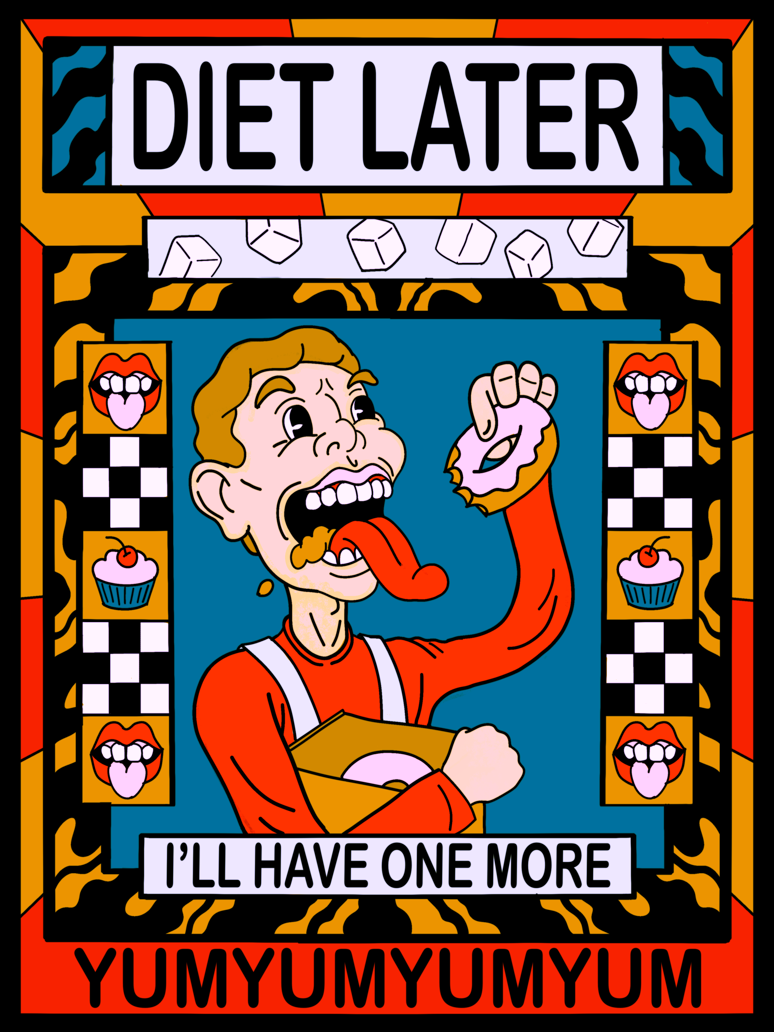 A colorful cartoon illustration of a man with a mustache, licking his fingers after eating a pizza. The background has a sign that says 'Diet Later' and text below that reads 'I'll Have One More,' with graphics of lips, cupcakes, and checkered patterns decorated around.