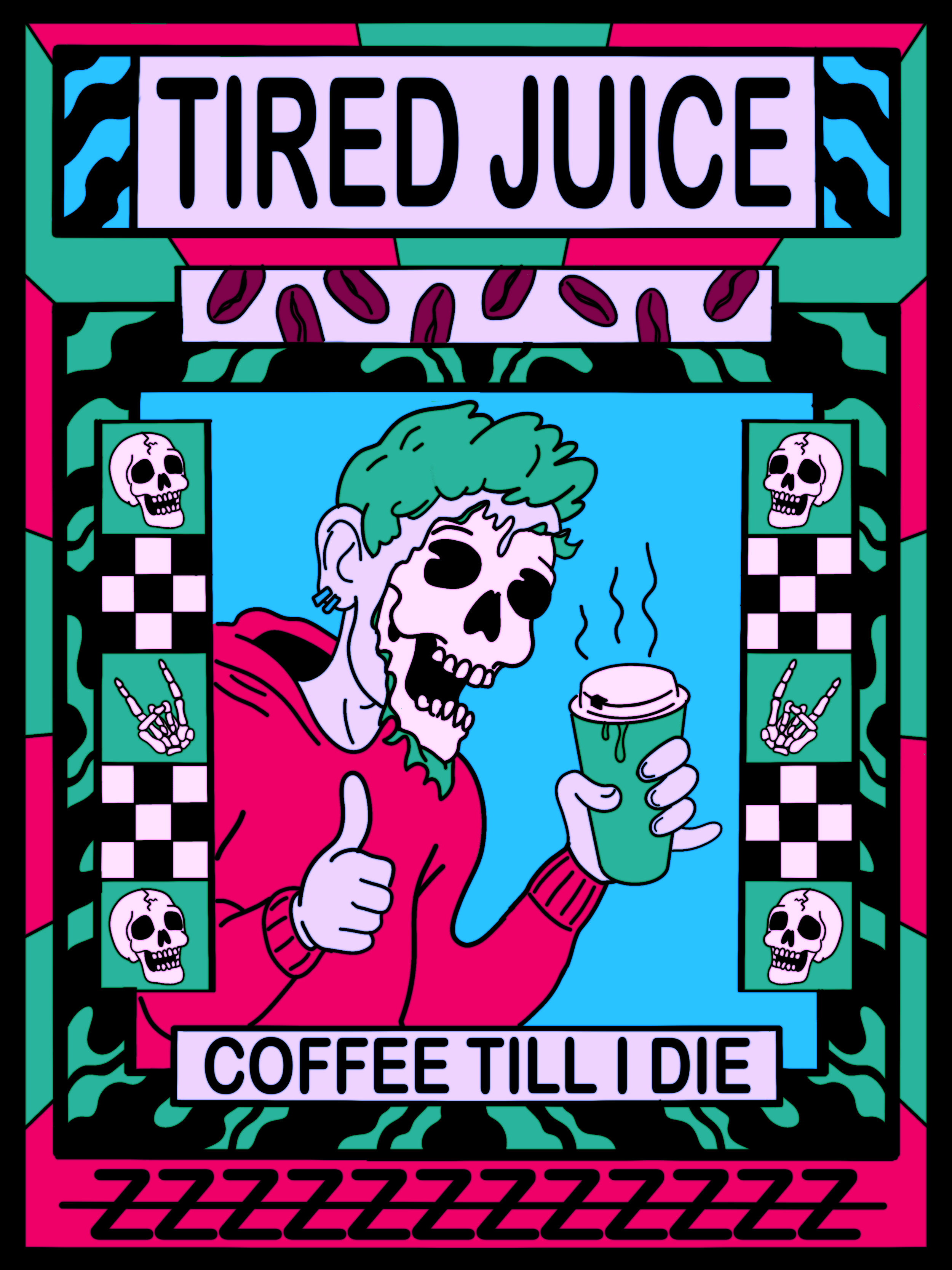 A colorful illustration of a skeleton with green hair, wearing a red hoodie, holding a cup of coffee, and giving a thumbs-up. The image is framed with skulls and skeleton hands, and has text that reads "Tired Juice" at the top and "Coffee 'til I Die" at the bottom. The background is bright with bold patterns and colors.