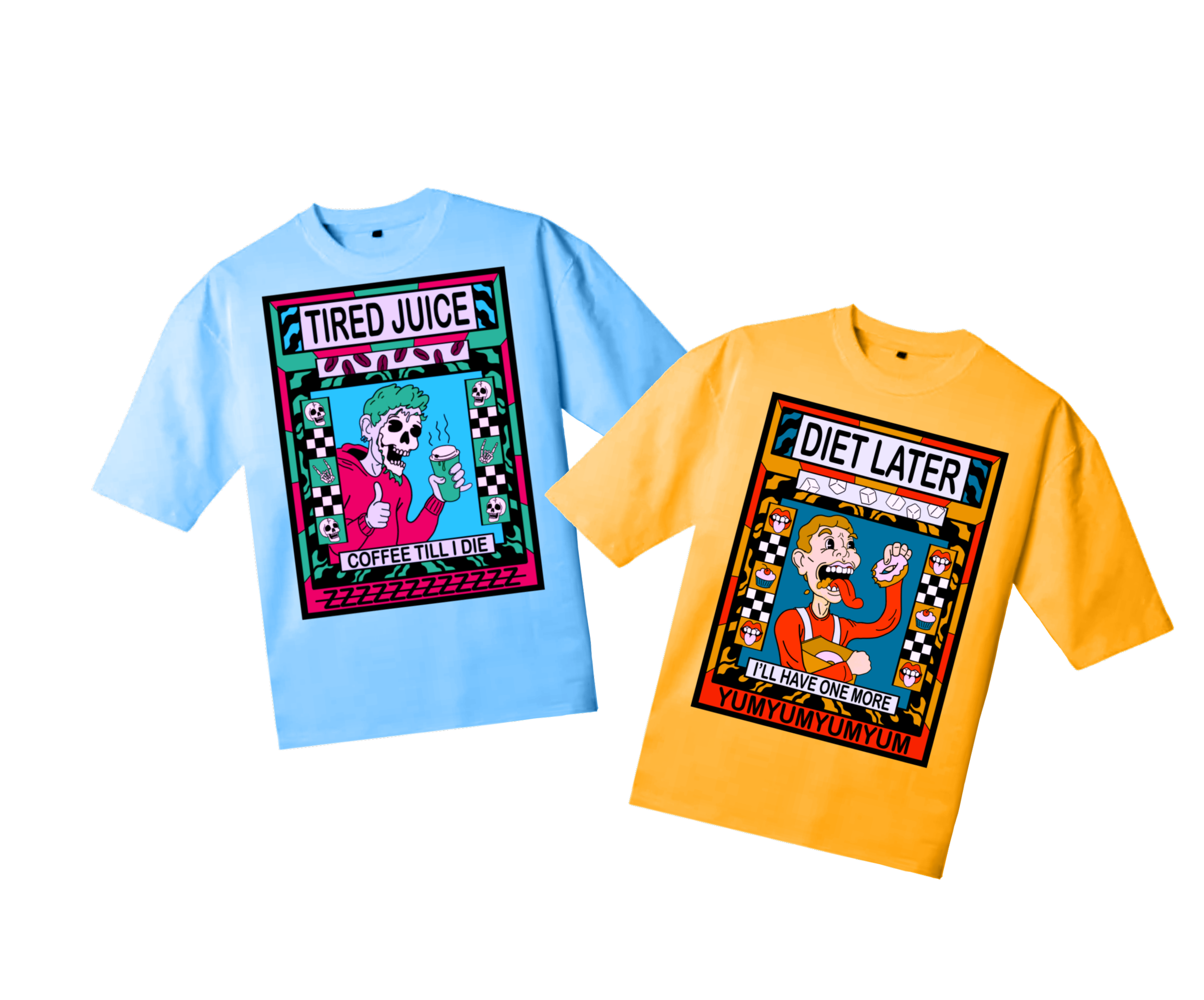 Colorful graphic t-shirts with humorous food and drink themes. One blue shirt says 'Tired Juice' and 'Coffee Till I Die' with a skeleton character holding a coffee. The other yellow shirt says 'Diet Later' and 'I'll Have One More' with a cartoon woman eating. Both shirts have bold, comic-style designs.